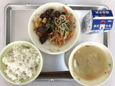 今日のメニューは、①むぎごはん ②レバーとポテトのナッツからめ ③ごま和え ④大根の味噌汁 ⑤牛乳です。
