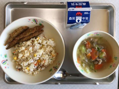今日のメニューは、①洋風まぜご飯 ②きびなごフライ ③野菜スープ ④牛乳です。
