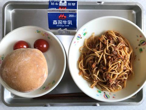 今日のメニューは、①きのこスープ ②ミートスパゲッティ ③ミニトマト ④牛乳です。