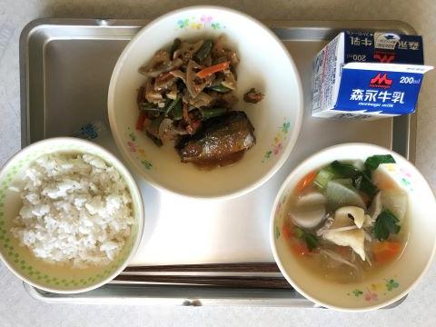 今日のメニューは、①むぎごはん ②たけみつこうなべ ③さんまのみぞれ煮 ④れんこんのきんぴら ⑤牛乳です。