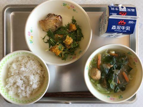 今日のメニューは、①むぎごはん ②鶏肉のハーブ焼き ③かぼちゃと水菜のサラダ ④根菜大根スープ ⑤牛乳です。