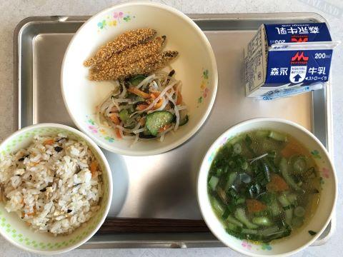 今日のメニューは、①びりんめし ②きびなごカリカリフライ ③ごまずあえ ④しらたまじる ⑤牛乳です。