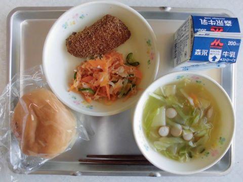 今日のメニューは、①まるパン ②ぶりフライ ③にんじんサラダ ④やさいスープ ⑤牛乳です。