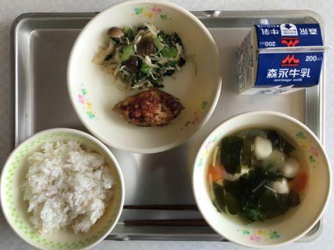 今日のメニューは、①むぎごはん ②とりのハーブ焼き ③チンゲンサイの和え物 ④すまし汁 ⑤牛乳です。