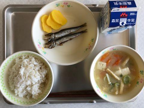 今日のメニューは、①むぎご飯 ②めざし ③たくあん ④味噌汁 ⑤牛乳でした。給食記念日の取組として、給食が始まった頃のメニューが作られました。子供達は、どのように感じたのでしょうか。