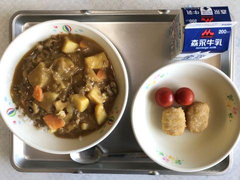 今日のメニューは、①むぎごはん ②冬野菜カレー ③ナゲット ④ミニトマト ⑤牛乳です。