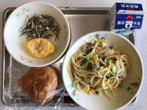 今日のメニューは、①パインパン ②豆乳クリームスパゲッティ ③オムレツ ④いりことアーモンド ⑤牛乳です。