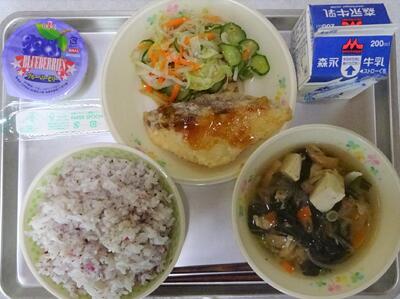 メニュー:ゆかりごはん 豆腐汁 鯛のからあげ 甘酢和え ブルーベリーゼリー 牛乳