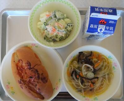 メニュー:ホットドック クイッテオスープ ポテトサラダ 牛乳