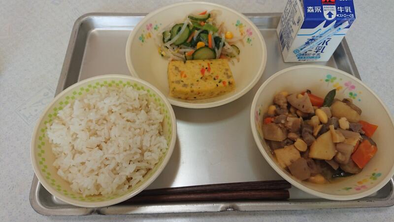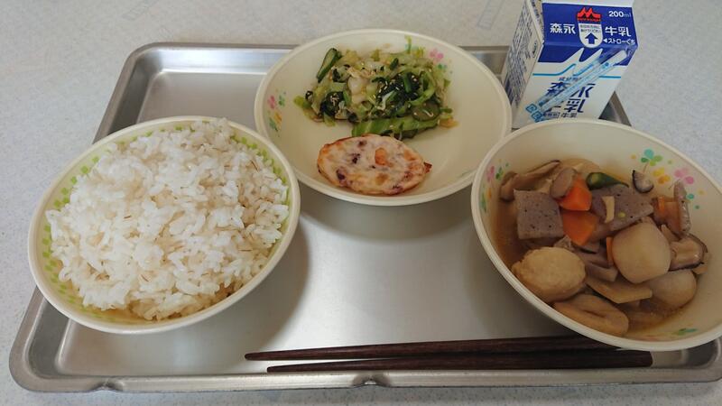 今日は、むぎごはん、筑前煮、イカの小判焼き、じゃこと野菜の和え物、牛乳でした。