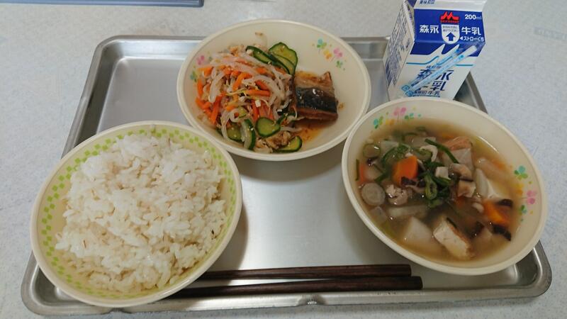 今日のメニューは、麦ごはん、のっぺい汁、サバの生姜煮、ごま酢和え、牛乳でした。