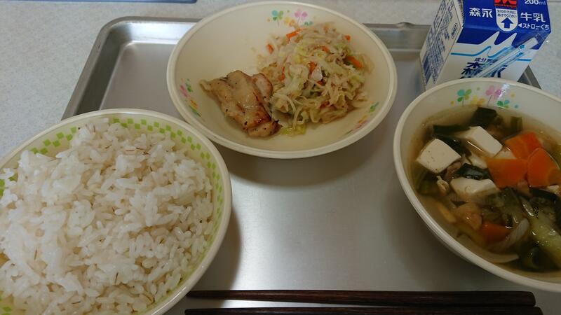 今日は、麦ごはん、豆腐汁、鶏肉のハーブ焼き、かみかみ和え、牛乳でした。