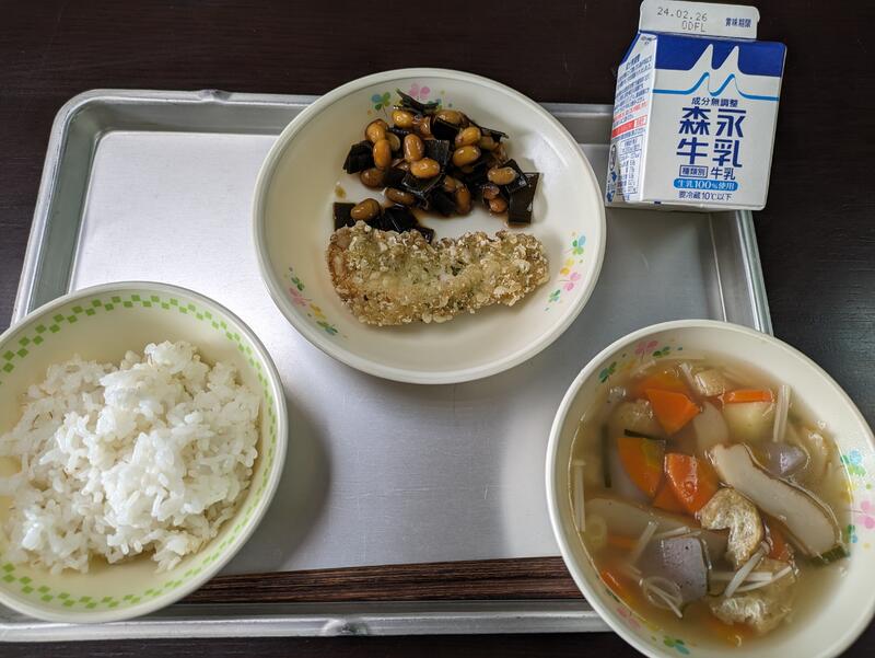 今日のメニューは、麦ご飯、たぬき汁、ホキのてん玉揚げ、座禅豆、牛乳でした。