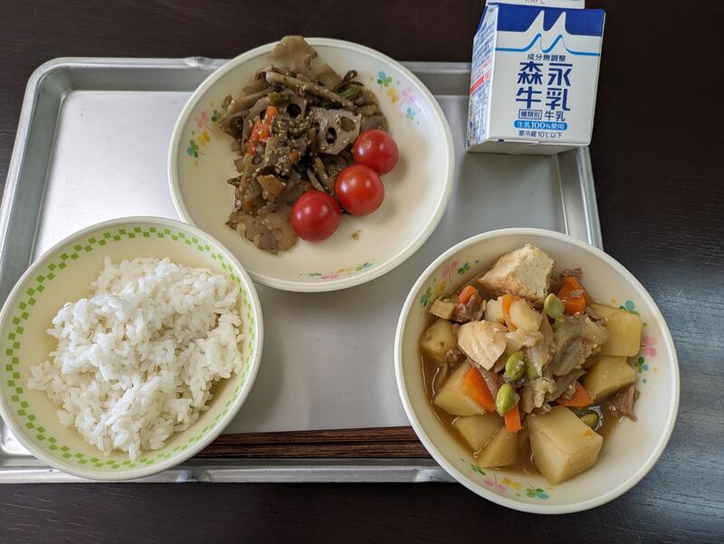 今日のメニューは、麦ご飯、肉じゃが、茎わかめと蓮根のきんぴら、ミニトマト、牛乳でした。