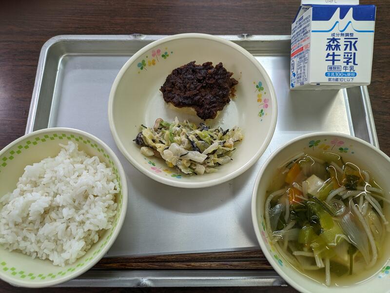 今日のメニューは、麦ご飯、魚そうめん汁、揚げ出し豆腐の肉味噌あんかけ、胡豆昆(ごずこん)サラダ、牛乳でした。