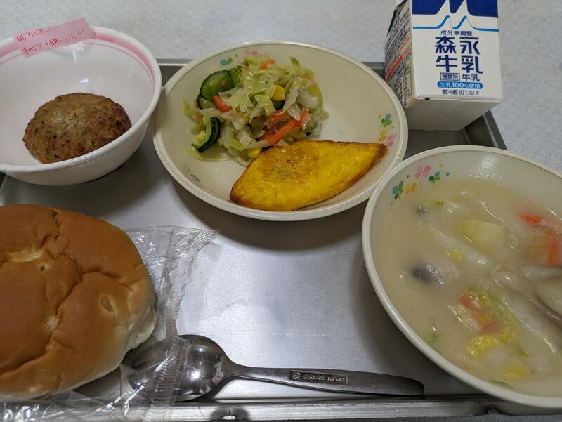 今日のメニューは、パインパン、白菜のクリーム煮、オムレツ(卵アレルギー対応は、豆腐ハンバーグ)、コールスローサラダ、牛乳でした。