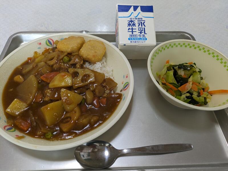 今日のメニューは、麦ご飯、根菜カレー、らっきょうサラダ、チキンナゲット、牛乳でした。