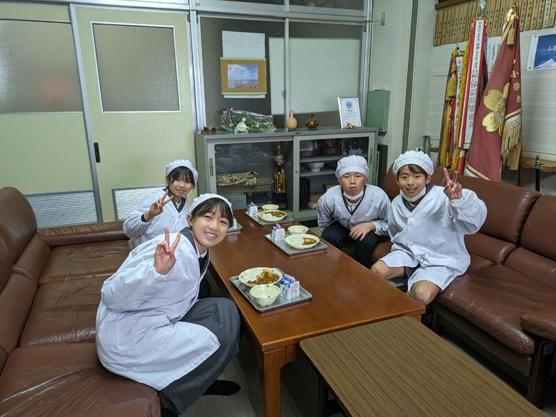 6年生が、卒業前にぜひ校長室で給食を食べたいとお願いに来てくれました。そこで、今日から、私(校長)の都合と6年生の都合が合う時に、班ごとに校長室で給食を一緒に食べて思い出づくりをすることになりました。私はいつもは検食をしなければならないのですが、検食は、教頭先生にお願いして、6年生と給食で会食させてもらうことになりました。とてもうれしいです。6年生にとっていい思い出になれば幸せです。