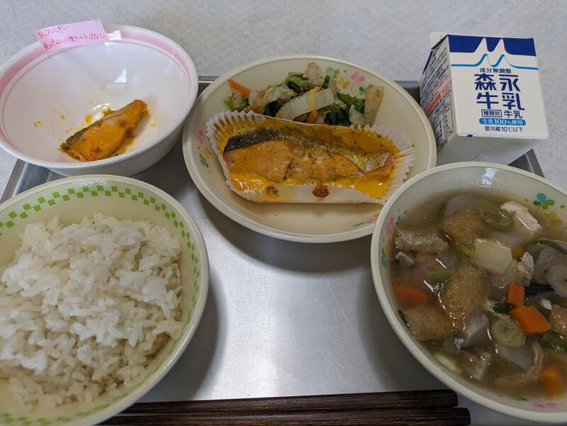 今日のメニューは、麦ご飯、のっぺい汁、魚のキャロット焼き(乳アレルギーは、チーズなし。)、白菜のおかか和え、牛乳でした。