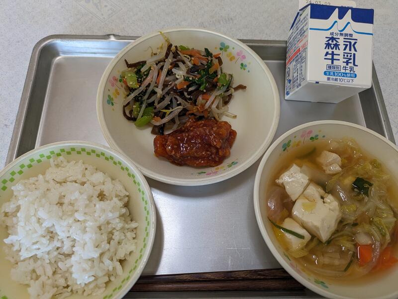 今日のメニューは、麦ご飯、キムチスープ、ヤンニョムチキン、もやしのナムル、牛乳でした。
