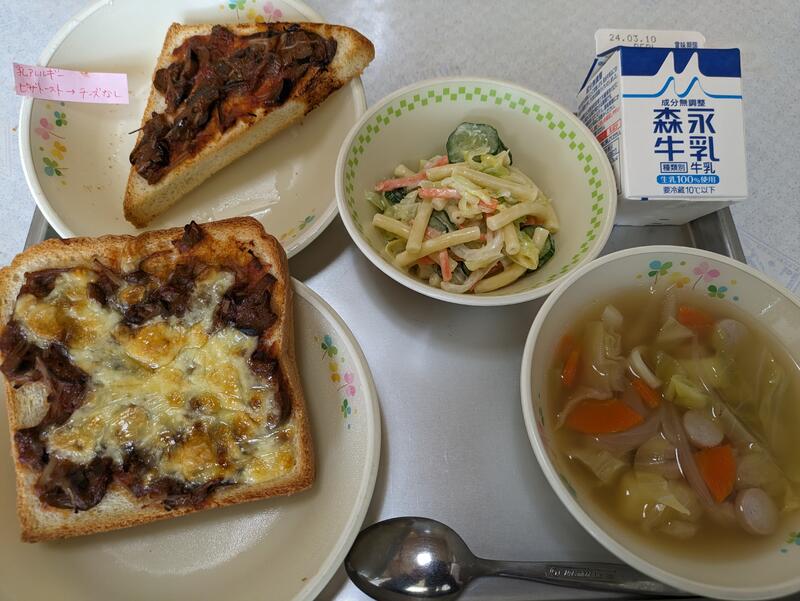 今日のメニューは、ピザトースト(乳アレルギー対応は、チーズなし。)、ポトフ、マカロニサラダ、牛乳でした。
