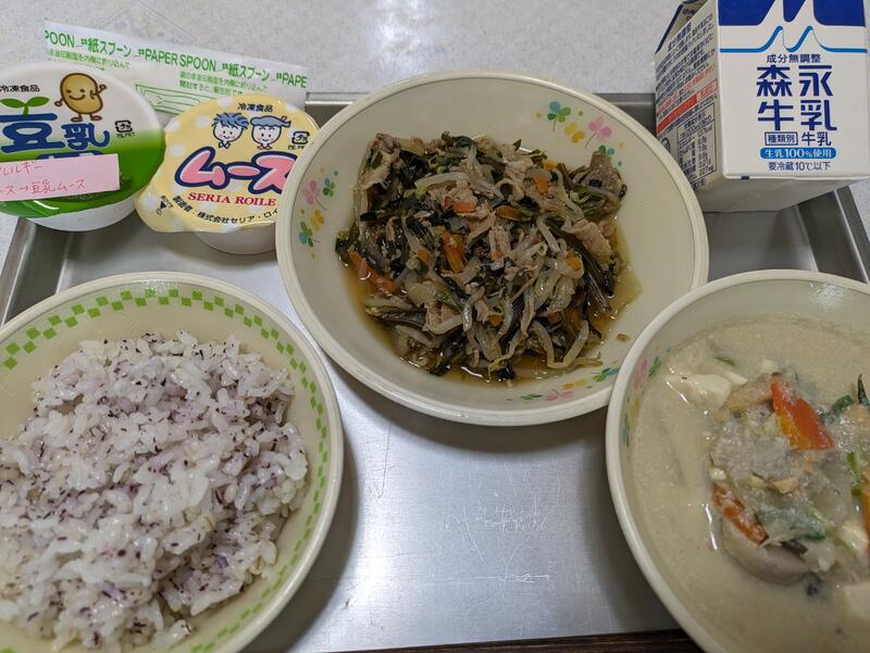 今日のメニューは、ゆかりご飯、呉汁、塩麹炒め、ムース(乳アレルギー対応は、豆乳ムース。)、牛乳でした。