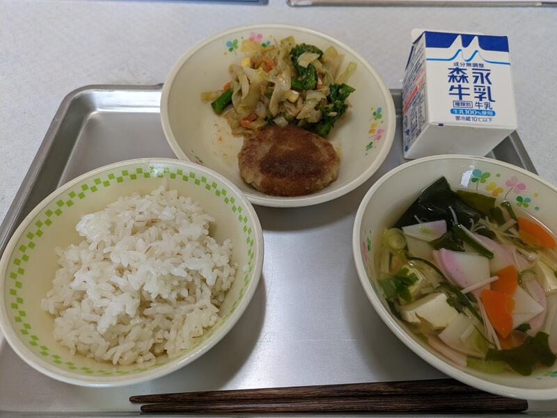 今日のメニューは、麦ご飯、すまし汁、豆腐ハンバーグ、菜の花和え、牛乳でした。