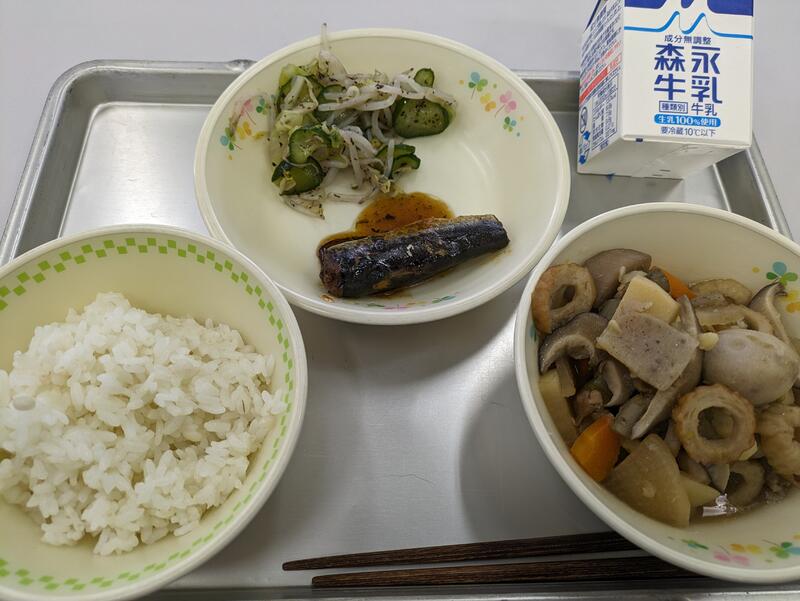今日のメニューは、麦ご飯、筑前煮、鰯の甘露煮、胡瓜のゆかり和え、牛乳でした。