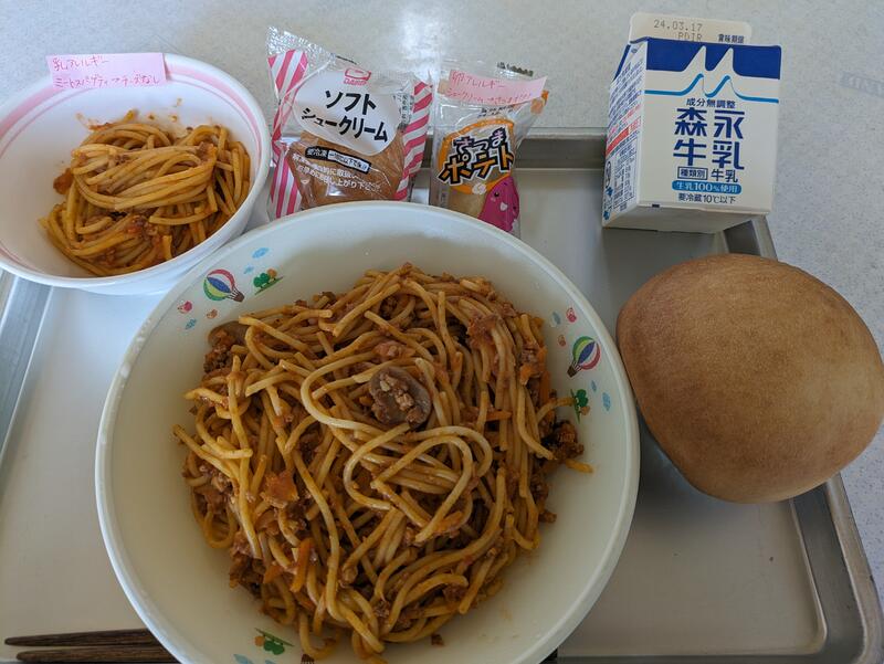 今日のメニューは、きのこスープ、ミートスパゲッティ(乳アレルギー対応は、チーズなし。)、シュークリーム(卵アレルギー対応は、さつまポテト)、牛乳でした。