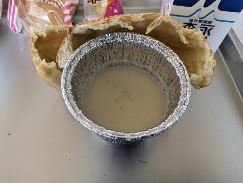 きのこスープは、6年生だけでなく全校児童が一番好きなメニューです。アルミカップにホワイトシチューを入れて、柔らかいパン生地を一つ一つカップにかぶせてオーブンで焼きあげて作ってくださいました。写真のようにまるできのこのように見えます。このパン生地とシチューがとてもおいしく、学校給食でこれが食べられることが信じられません。たいへんな労力と愛情がこもっているのでいっそうおいしいきのこスープになっていました。