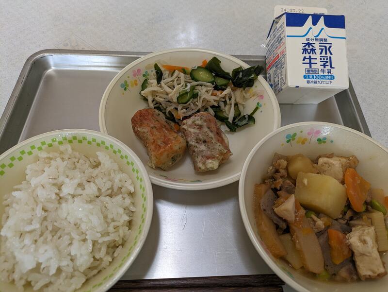 今日のメニューは、麦ご飯、うま煮、竹輪の磯辺揚げ、切り干し大根の酢物、牛乳でした。