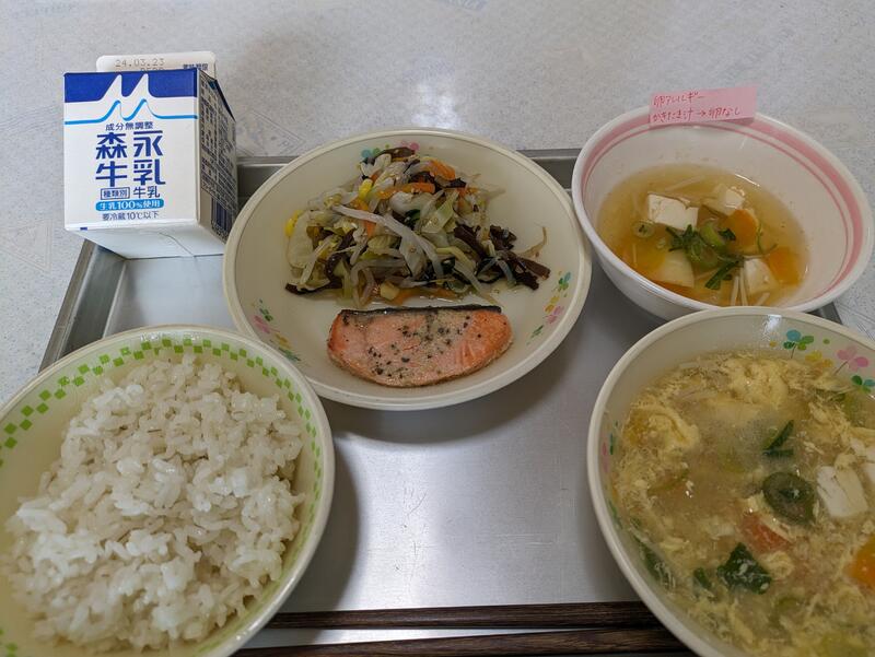 今日のメニューは、麦ご飯、かき卵汁(卵アレルギー対応は、卵なし。)、鮭のハーブ焼き、五色和え、牛乳でした。