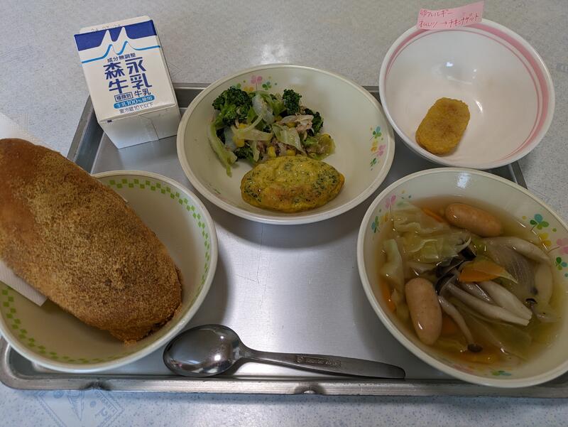 今日のメニューは、揚げパン、野菜スープ、オムレツ(卵アレルギー対応は、チキンナゲット。)ブロッコリーサラダ、牛乳でした。