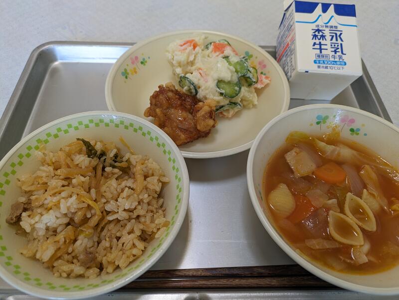 今日のメニューは、キムたくご飯、ミネストローネ、鶏の唐揚げ、ポテトサラダ、牛乳でした。