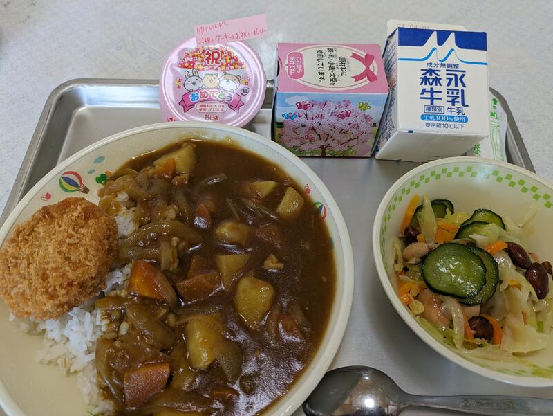 今日のメニューは、6年生の卒業をお祝いする献立でした。麦ご飯、カレー、ヒレカツ、豆サラダ、お祝いケーキ(卵アレルギー対応は、お祝いゼリー。)、牛乳でした。