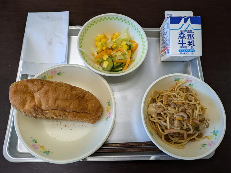今日のメニューは、きな粉揚げパン、焼きそば、コーンサラダ、牛乳でした。