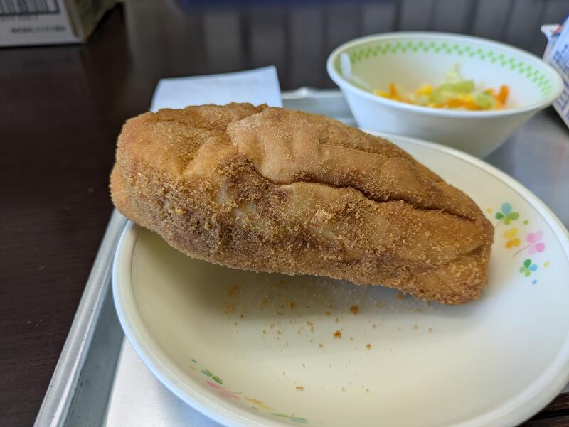 今日は、子どもたちや先生方も7月の献立表もらったらすぐにチェックした揚げパンの日でした。横島小の揚げパンは、ほどよく揚がったコッペパンをきな粉と黒砂糖でたっぷり絡めた、超人気のきな粉揚げパンです。
