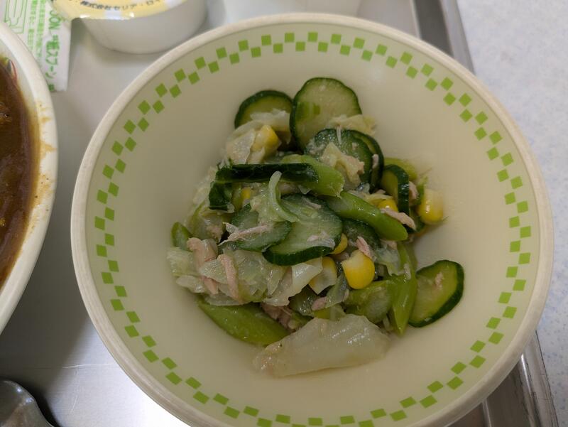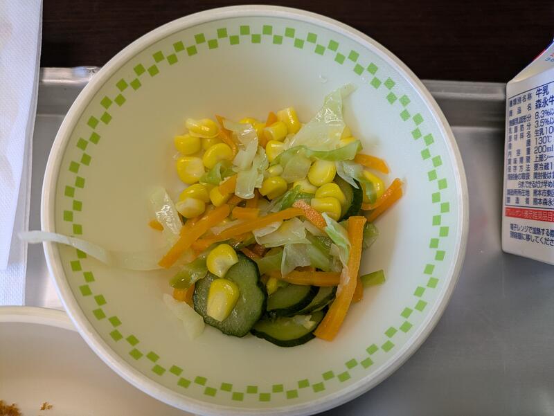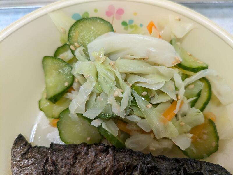 じゃこサラダは、キャベツと胡瓜、チンゲン菜に、子どもたちが好きなコーンと、サラダに程よい量のじゃこが入れてあり、さっぱりした塩加減と、コーンの甘みがとても良いバランスのおいしい和のサラダでした。