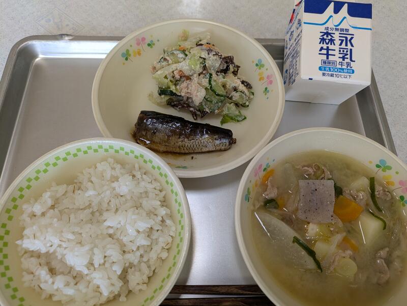 今日のメニューは、麦ご飯、豚汁、鰯の甘露煮、卯の花和え、牛乳でした。