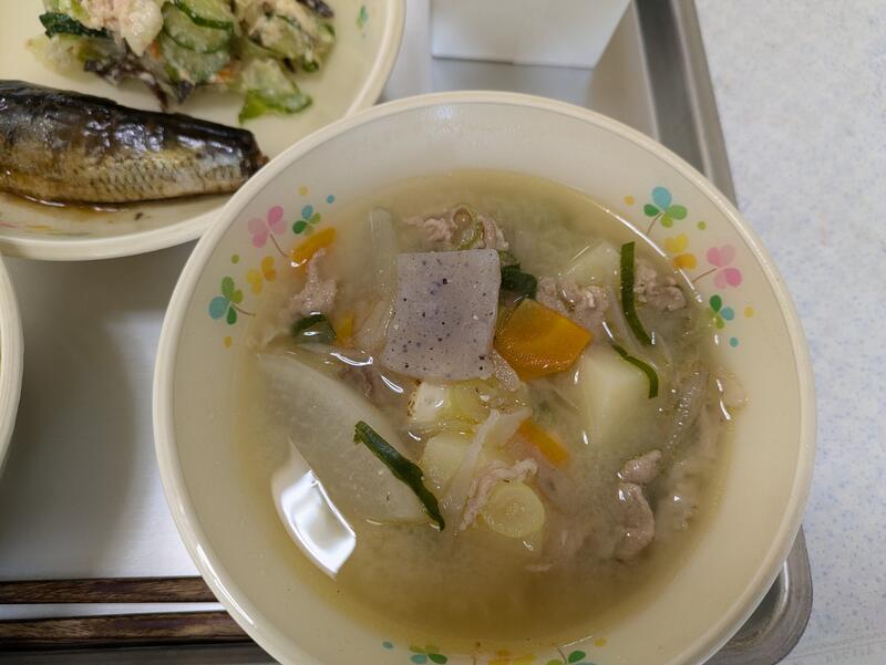 まず豚汁は、豚肉にたっぷりの野菜が入った、いりこの出汁と生姜が効いた疲労回復にピッタリのとてもおいしい豚汁でした。