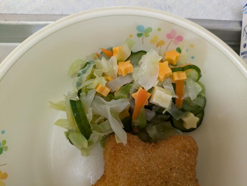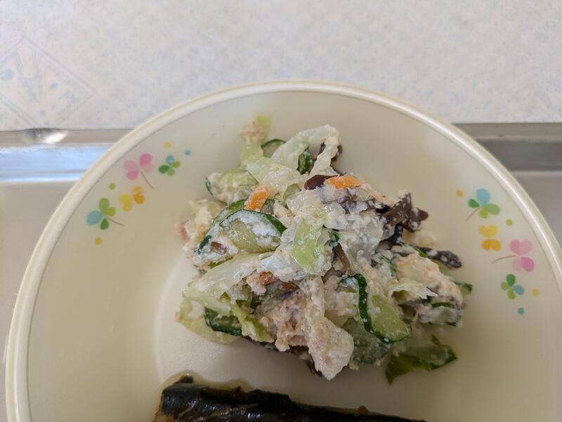 グリーンサラダは、アスパラや胡瓜、キャベツ、コーン、ツナに手作りのドレッシングがかけてあり、子どもたちが食べやすいように作ってありました。