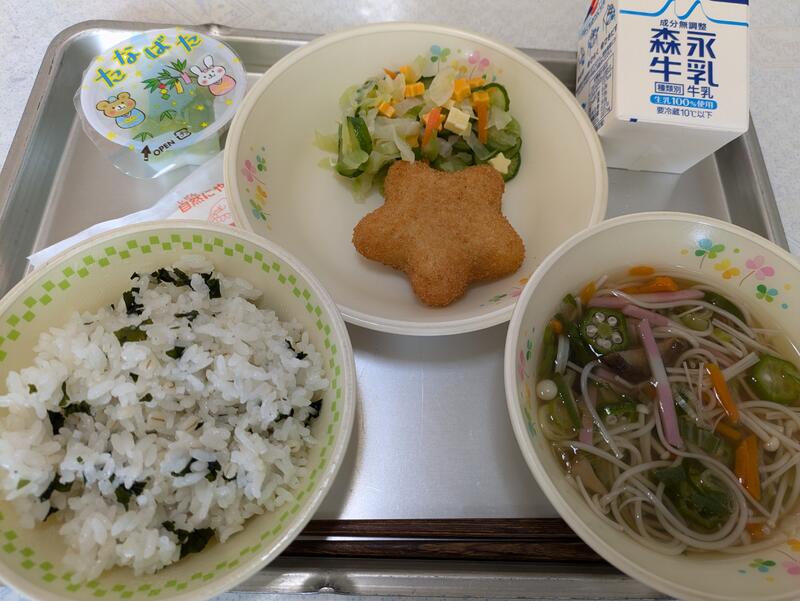 今日のメニューは、わかめご飯、天の川汁、星のコロッケ、チーズサラダ、七夕ゼリー、牛乳でした。