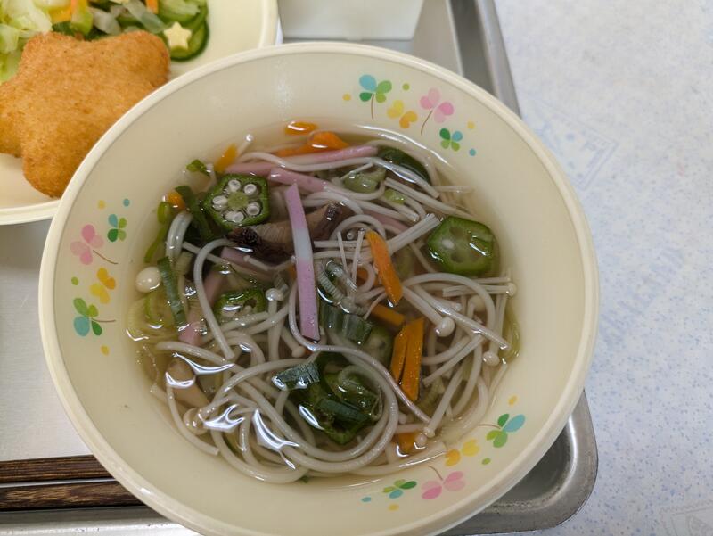 天の川汁は、容器の中に通常の白色の素麺と、抹茶素麺、梅しそ素麺の3種類の素麺が入れてあり、天の川に見立ててありました。オクラを横に切った形が星形をしているので、彦星と織姫や夜空に輝くお星さまを表現してありました。横島小は、自校給食だから素麺が伸びずにおいしくいただけます。また、彩がきれいで、見映えがとてもよかったです。出汁と具材の旨味もよく合っていておいしかったです。