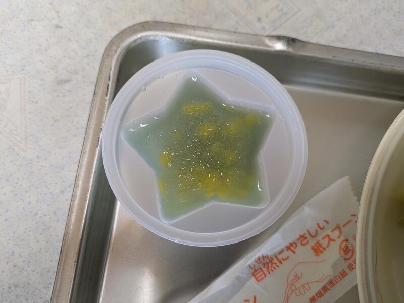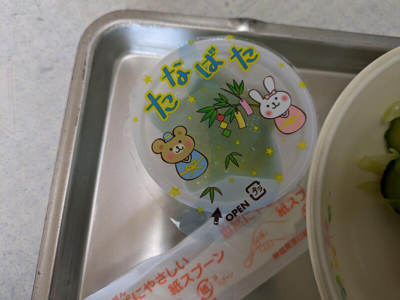 その上に今日は、七夕ゼリーまで出ました。このゼリーも見映えが良く、味は、甘いレモンソーダのようで、子どもたちは、大喜びしたと思います。