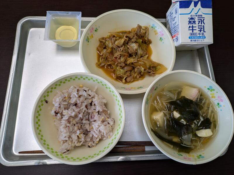 今日のメニューは、雑穀ご飯、中華スープ、回鍋肉、手作りりんごゼリー、牛乳でした。