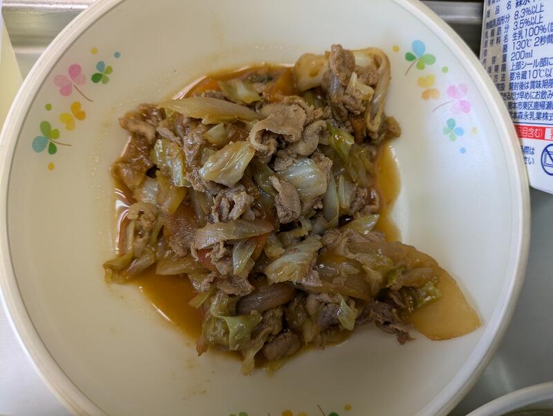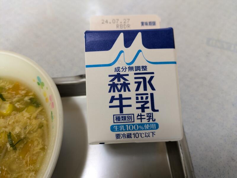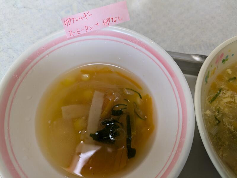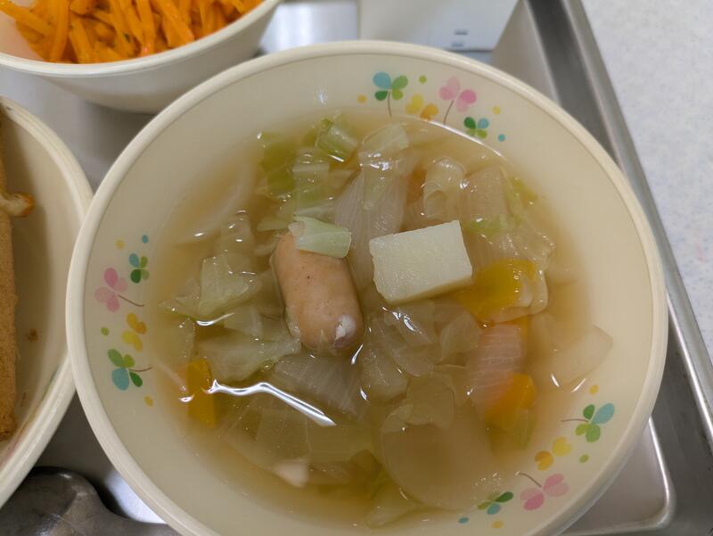 スーミータンは、とき卵の入った中華料理のコーンスープだそうです。横島小のスーミータンは、鶏の出汁に野菜を子どもたちが食べやすいように切って入れてあり、甘くておいしい二種類のコーンが使われていて、とき卵もふわっとした食感でとてもおいしかったです。