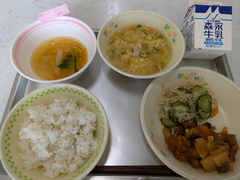 今日は、学校も午前中は、結露がすごく、むしむしした気持ちの良くない空気間でした。そして、午後は、曇り空から一転して真夏の日差しを感じる天気になりました。こんな日は、子どもたちも先生方も身体の調子が良くなく、疲れてしまいがちです。そんな状態を察してか、今日の給食は、さっぱりとして、なおかつ元気の出る献立でした。