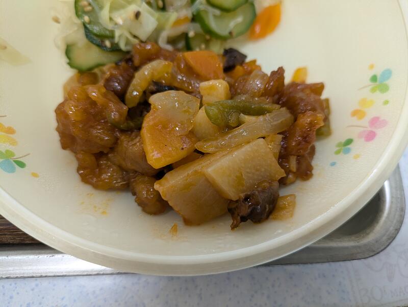 坦々春雨スープは、中華の坦々麺を春雨にして、子どもたちが辛さを感じずにおいしく食べられるように味付けしてありました。中華料理店でいただく担々麺のスープのようなおいしさで、春雨の喉越しと野菜の旨味がとてもよかったです。