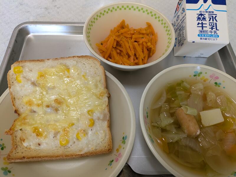 今日のメニューは、クロックムッシュ、ポトフ、キャロットラぺ、牛乳でした。