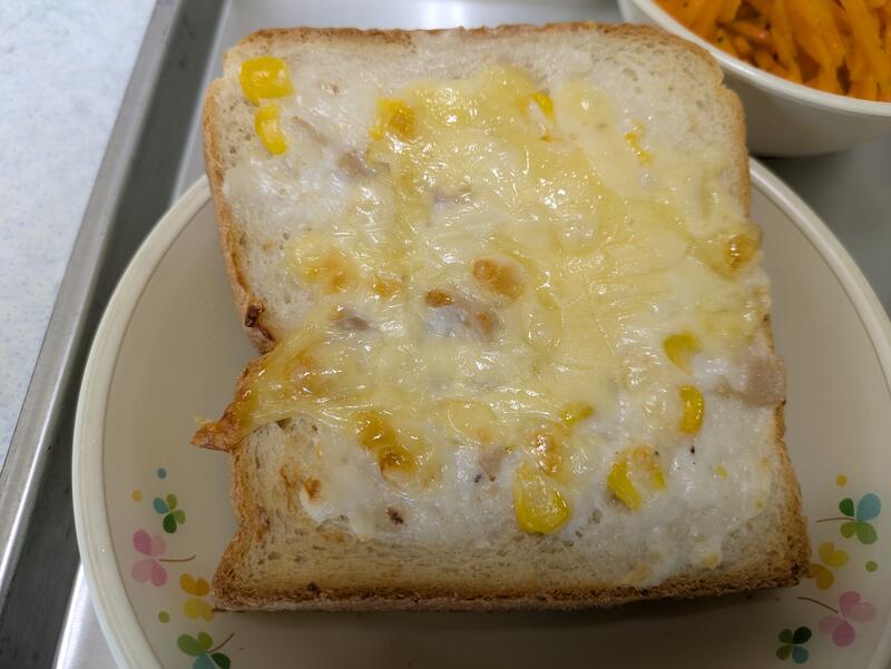 横島小のクロックムッシュは、米粉とバターと牛乳を塩コショウで味付けされた手作りのホワイトソースに、食べやすいように切られたロースハムと、とうもろこしをまぜて食パンにのせ、その上にチーズをのせてオリーブオイルをぬってオーブンで焼きあげてありました。